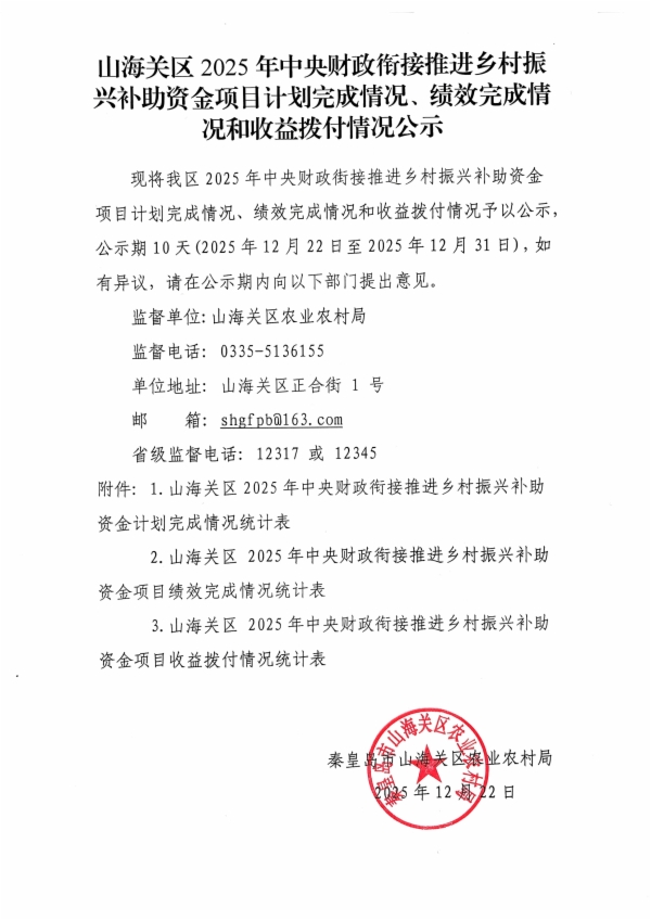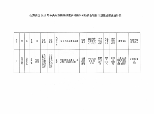 山海关区2025年中央财政衔接推进乡村振兴补助资金项目计划完成情况、绩效完成情况和收益拨付情况公示