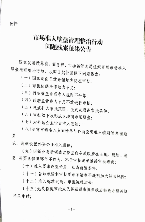 市场准入壁垒清理整治行动问题线索征集公告